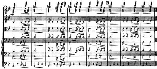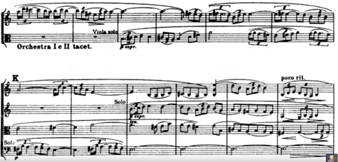 Next part of the Fantasia is the second episode where A3 exploded. Example 7 shows an example of this where the solo viola plays a variation of A3. The melodic material is based closely on Tallis`s tune, which we can see on the first three notes of the solo viola melody. They are reflected from the repeated notes which occur in the first two strains and also at the end of Tallis`s hymn. It gives the part a rhapsodic feeling.