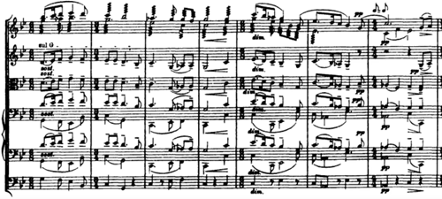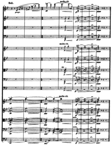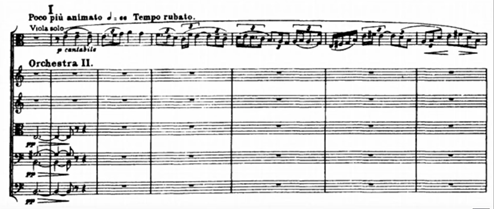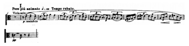 In the second episode of the Fantasia the A3 is exploded. Example 6 represents this where the solo viola plays a variation of A3. The melodic material is based closely on Tallis`s tune, which we can see on the first three notes of the solo viola melody. They are reflected from the repeated notes which occur in the first two strains and also at the end of Tallis`s hymn. It gives the part a rhapsodic feeling.
