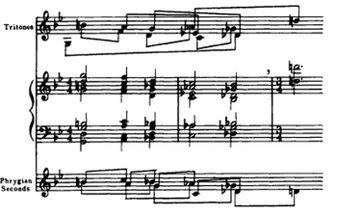 In his outer sections, Vaughan Williams used various elements of the Phrygian mode which he contrasted with elements of the Dorian (occasionally Lydian) in the rhapsodic centre of the piece. Tritones and semitones are also incorporate in the harmonic relationships. For example, while the composer preserves the minor third and seventh of the Phrygian mode, the piece sounds as major second above the tonic and dominant pitches instead of Phrygian minor. Example 15 shows the mode transposed to E.
