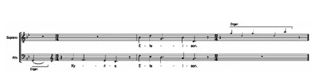 Pärt is using the tintinnabuli method which is characterized by two types of voice. The first of which arpeggiates the tonic triad and the second of which moves diatonically in stepwise motion. For example this technique is displayed in the Kyrie by the sopranos and tenors sing only notes of a triad chord and their lines move by leaps and the altos and tenors start each phrase on a note which is not in the triad and their lines move only stepwise. Example II shows the complete tintinnabulating passage in measures 2-4 between the soprano voice and organ. After the establishment of the first tintinnabulating chord B in the soprano line, Pärt brings the tintinnabulating line into the organ by an octave higher and continue the process he started in the soprano. (Forrestal, 2011)