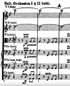 The Fantasia uses Tallis`s psalm as a main theme (subject) which the composer applied in several ways. As a response to another theme, as a transition from one theme to another or as an approach to or departure from a climax, and as a theme in its own. Vaughan Williams also breaks up the hymn into subthemes. For example, A1. A rising theme which begins with an identifying minor third interval. Example 1 shows this interval plucked in the lower strings at the beginning of the piece.