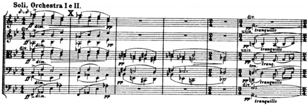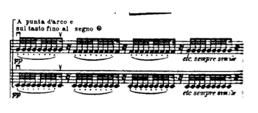 In the third episode we arrive to the major climax of the work. The “swaying” subject extended and brings to a new melodic path with annotations played by the string quartet (Example 9).