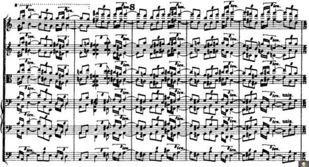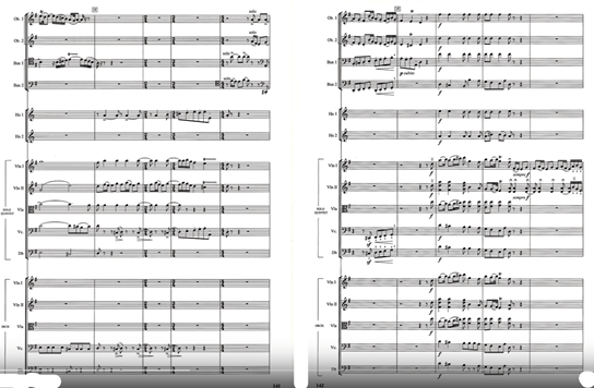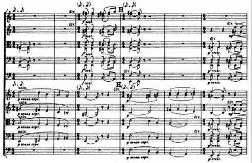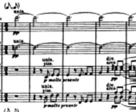 After the solo, we can hear the A3 subtheme in a polyphonic style played by the string quartet. The third episode is the major climax of the work. The “swaying” subject extended and brings to a new melodic path with annotations played by the string quartet (Example 8).