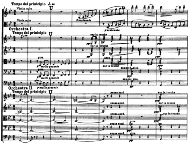In the Restatement the lower strings begin to pluck Tally’s hymn (A1) which supported with a soft sound played by the Orchestra II. The solo violin and viola duet come in with theme A2, A3 and “sway” (Example 12). Finally, all instruments join together to play the A4 theme (Example 13).