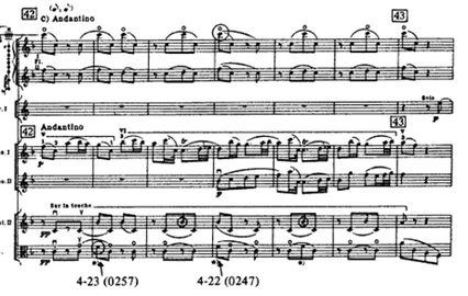 In the viola solo, the composer tended to use F# and C# to avoid F♮ and C♮. However, the C♮ of the Phrygian mode appears which gives Lydian sound to the piece. (Example 7)