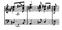 Example 16 shows the section which leads to the central part. The composer tended to use F# and C# to avoid F♮ and C♮. However, the C♮ of the Phrygian mode appears (Example 17). This example also shows the coincidence of C♮ and F# which gives Lydian sound to the piece.