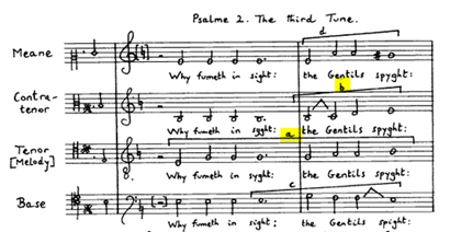 The introduction is followed by a full statement (bar 15 in Ex 5) where Tallis all themes sound in their full forms. In the first episode A2 and A3 explored by first the A2 alternate with the sway (Example 6, a) than A3 (Example 6, b).