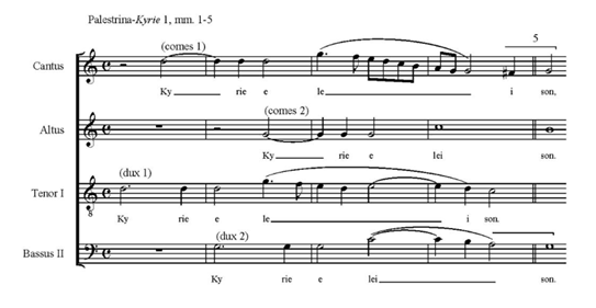 Although the score is different, the structure of the Kyrie is similar in both masses. It has three distinct sections (Kyrie eleison, Christe eleison and Kyrie eleison). The two composers use different compositional technique however both of them are influenced by Gregorian chant. Palestrina`s Kyrie consists of imitative polyphony which is based on the main motif. The basic melodies and their words are stated early in a single voice before the other layers (voices) are gradually added which represented by Example 1 where the piece begins with Tenor I followed by Cantus, than Bassus II and finally the Altus. The composer also uses imitation which also can be seen. While the work is written to six acapella voices, the announcement of the text with the motive ideas is represented by only four and the movement set up as two duets. Palestrina also uses a contrapuntal texture and perfect intervals in Tenor I (D rises to G by perfect 4th, then descends to C by perfect 5th). (Gutmann, 1998) (Moore, 2006)